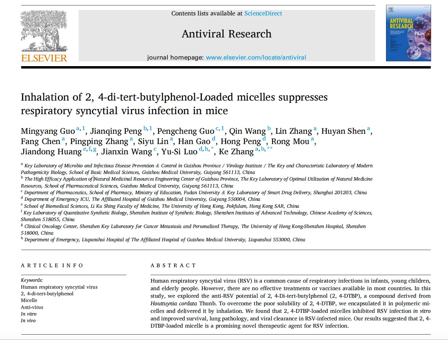 2024年4月,公司病原生物学实验室2020级硕士研究生郭名扬为第一作者,永利yl23411集团官网入口附属医院罗语思主任医师,永利yl23411集团官网入口张科副教授为共同通讯作者在病毒学类国际期刊《Antiviral Research》(JCR Q1,中科院2区,影响因子7.6)发表题为《Inhalation of 2, 4-di-tert-butylphenol-loaded micelles suppresses respiratory syncytial virus infection in mice》的研究论著。 该论文获得了国家自然科学基金、贵州省科技厅技术创新团队项目和永利yl23411集团官网入口附属医院博士启动基金等项目的资助。
