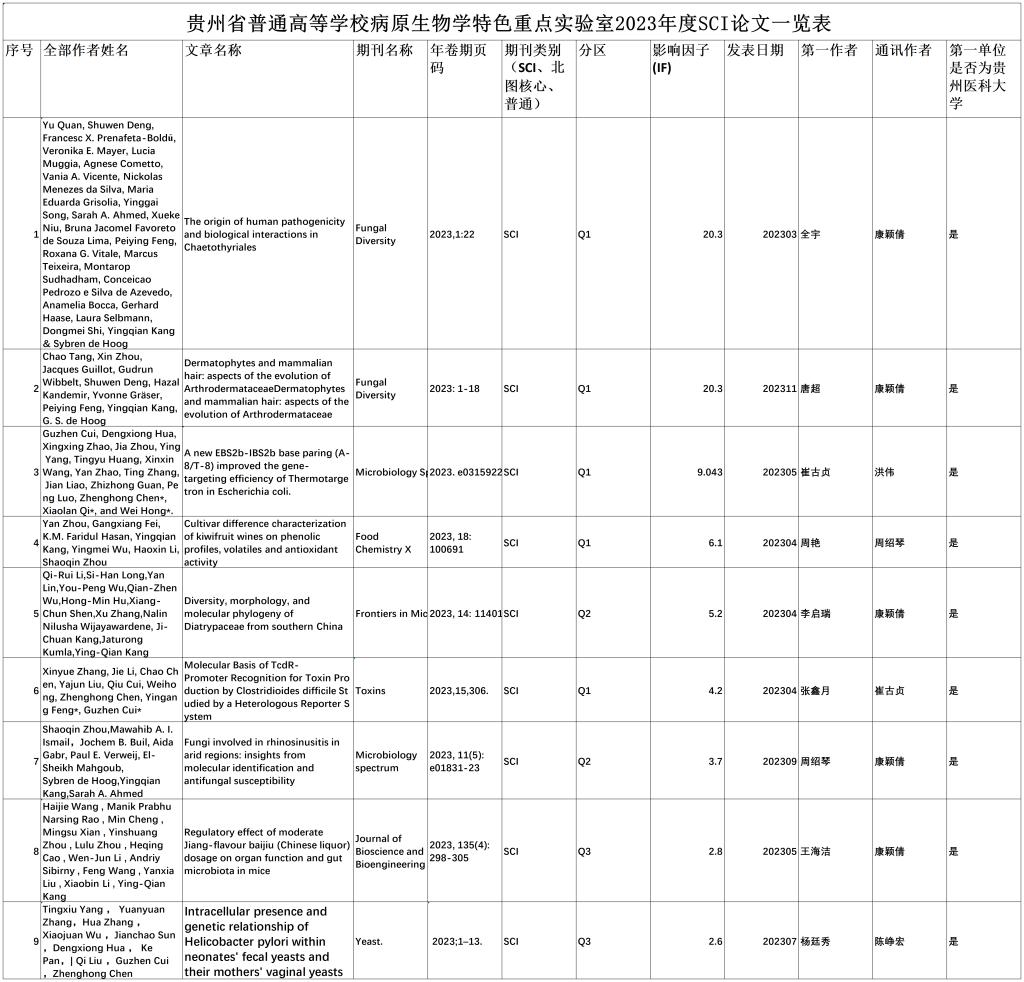 贵州省普通高等公司病原生物学特色重点实验室2023年度SCI论文一览表