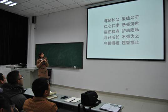 为进一步促进2013级卓越医师班员工对临床专业的深入了解,尽早明确今后努力的方向与目标,增强卓越医师班员工学医的坚定信念,医员工物工程系团委副书记杨晖老师应卓越班深情相邀,于2013年11月15日下午4:30在4308教室,给卓越班全体同学进行了以“进入临床,你准备好了吗?——考研推免 规陪 执照”的主题讲座,讲座由卓越班班主任董然然主持。