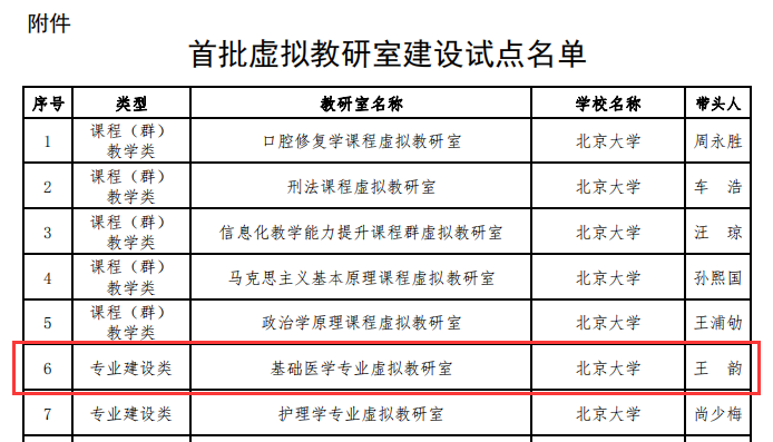 近日教育部发布《教育部办公厅关于公布首批虚拟教研室建设试点名单的通知》,公司永利yl23411集团参与申请的协和医公司王辰院士作为带头人的“生理课程虚拟教研室”、北京大学王韵教授作为带头人的“基础医学专业虚拟教研室”获批教育部首批虚拟教研室建设试点。