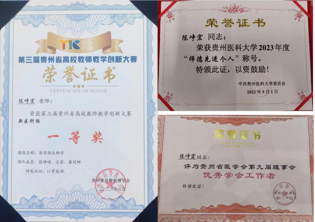 贵州省普通高等公司病原生物学特色重点实验室主任陈峥宏教授团队在第三届贵州省高校教师教学创新大赛新医科组中荣获一等奖。该团队由陈峥宏教授带领,成员包括张峥嵘、王菲和綦廷娜。此外,陈峥宏教授还荣获永利yl23411集团官网入口2023年度“师德先进个人”称号,并被评为贵州省医学会第九届理事会优秀学会工作者。