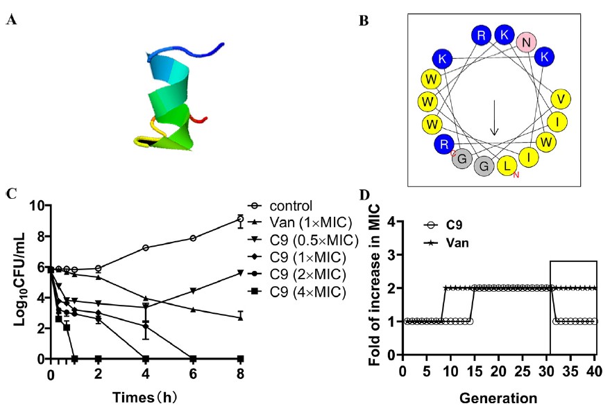 图1. C9表现出对表皮葡萄球菌的杀菌活性,且不易导致耐药。