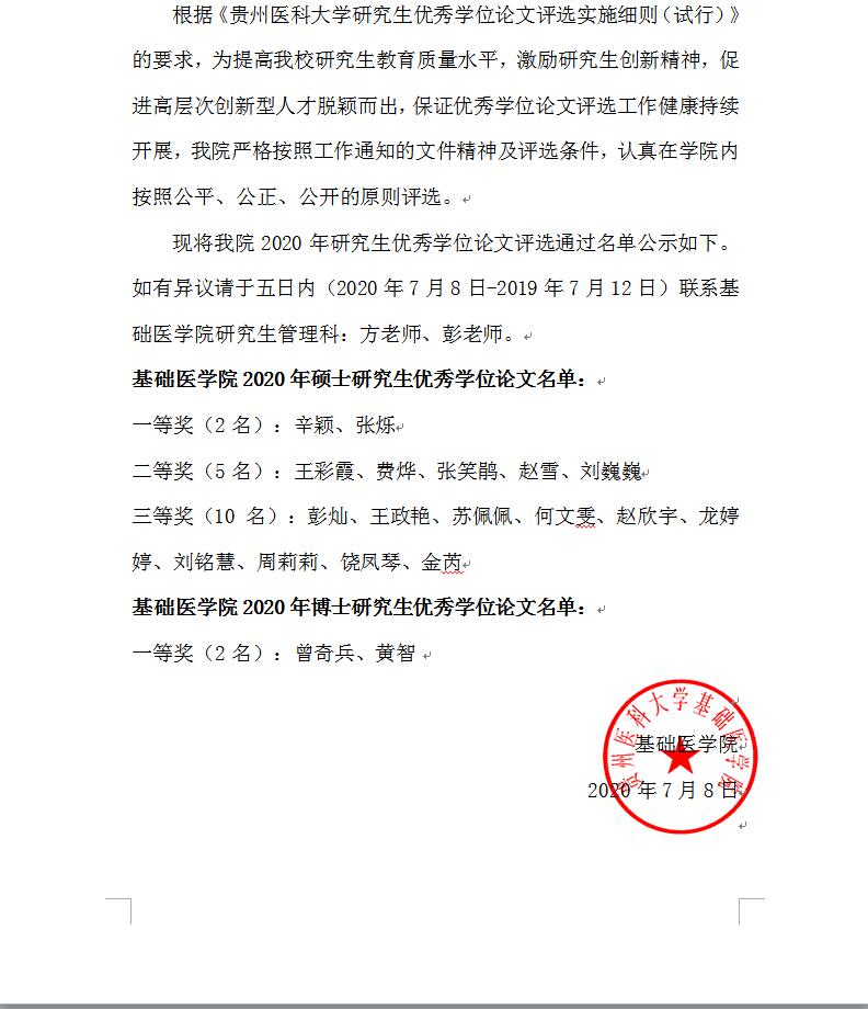 关于2020年研究生优秀学位论文评选的公示