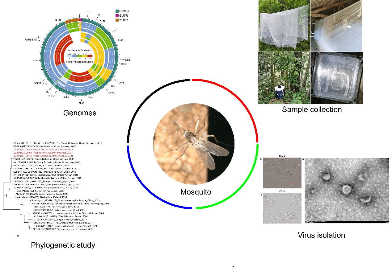 蚊虫可携带多种病毒,这些病毒对人类、动物和牲畜构成威胁。研究发现,对野外蚊虫携带病毒的调查对于建立监测系统和早期发现疾病有着重要作用。除了蚊媒病毒外,蚊虫还携带昆虫特异性病毒(Insect-specific viruses, ISVs)。广平病毒(Quang Binh virus, QBV)被归类为黄病毒科(family Flaviviridae)中的一种ISV。QBV主要在越南和中国的多种蚊虫中被发现。该研究于2021年在中国贵州省进行,共采集了32177只成年雌蚊,其中三带喙库蚊(Culex tritaeniorhynchus)是主要的蚊种之一。从三带喙库蚊中检测到3个阳性培养物含有QBV RNA序列。系统进化分析显示,贵州分离株与越南原型株形成了独特分支,与中国报道的其他QBV分离株密切相关。此外,贵州分离株与越南和中国其他分离株在核苷酸和氨基酸上有高度相似性,并出现了非同义单核苷酸变异。此项研究首次报道了贵州省三带喙库蚊携带QBV的情况,为深入了解其基因组和丰富对昆虫特异性黄病毒(Insect-specific flaviviruses,ISFVs)的认识提供了重要的基础数据。
