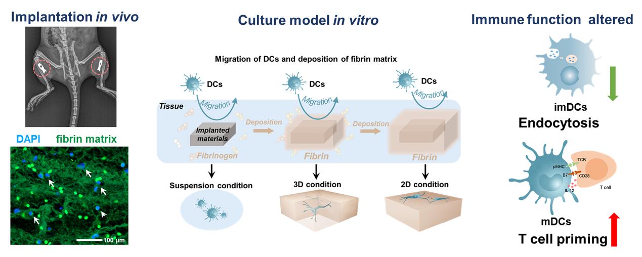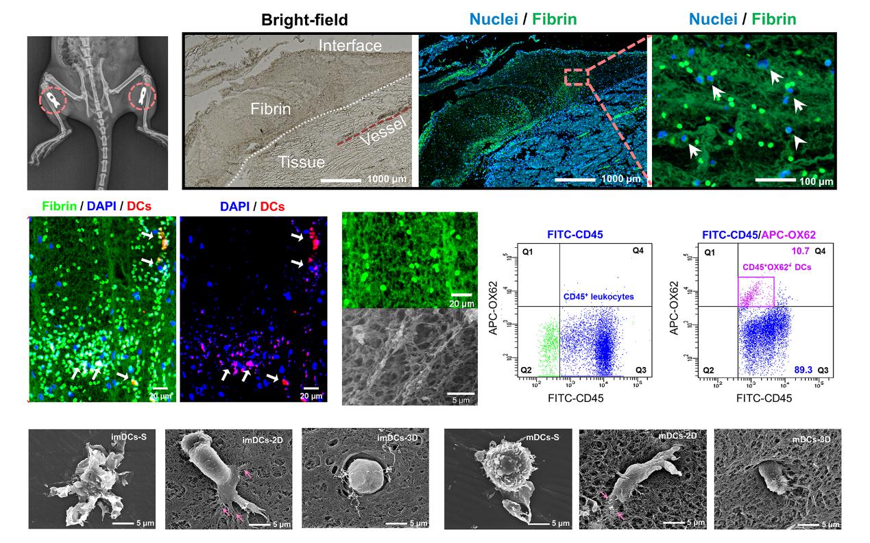 图1. 生物材料植入诱导的纤维蛋白基质沉积和DCs的募集