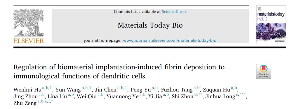 2022年2月26日,永利yl23411集团曾柱教授领衔的PI团队在Materials Today Bio杂志上发表了题为Regulation of biomaterial implantation-induced fibrin deposition to immunological functions of dendritic cells的研究论文。该研究发现,DCs能够响应局部病理微环境和力学微环境,表现出明显的形态改变和细胞骨架重构,并获得相应的免疫表型和力学表型,其力学-化学耦合机制涉及RhoA和CDC42信号通路。这项工作不仅有助于更好地理解植入生物材料引发的免疫反应的精确过程,而且对生物材料的合理设计具有重要意义。